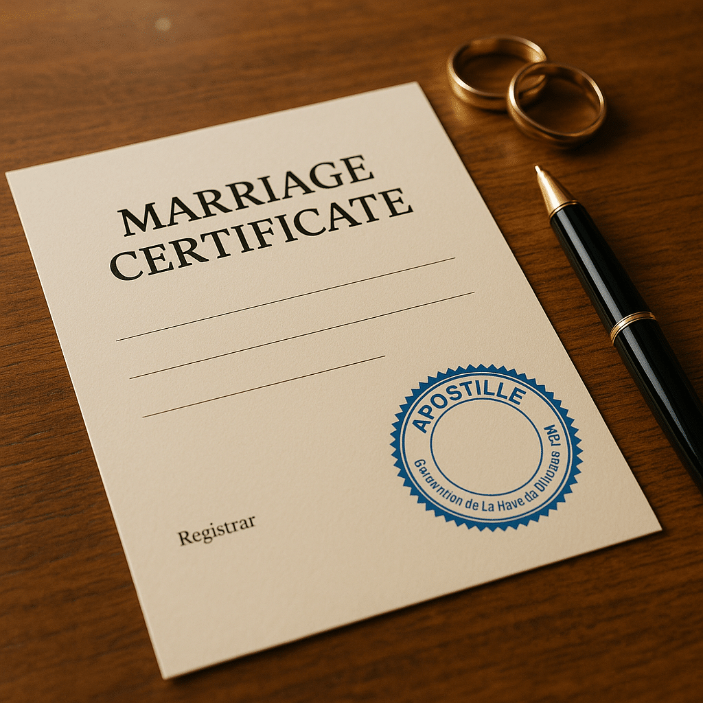 הצוות המשפטי שלנו מטפל בכל המסמכים, האימותים והתרגומים. - תעודת נישואין עם חותמת אפוסטיל
